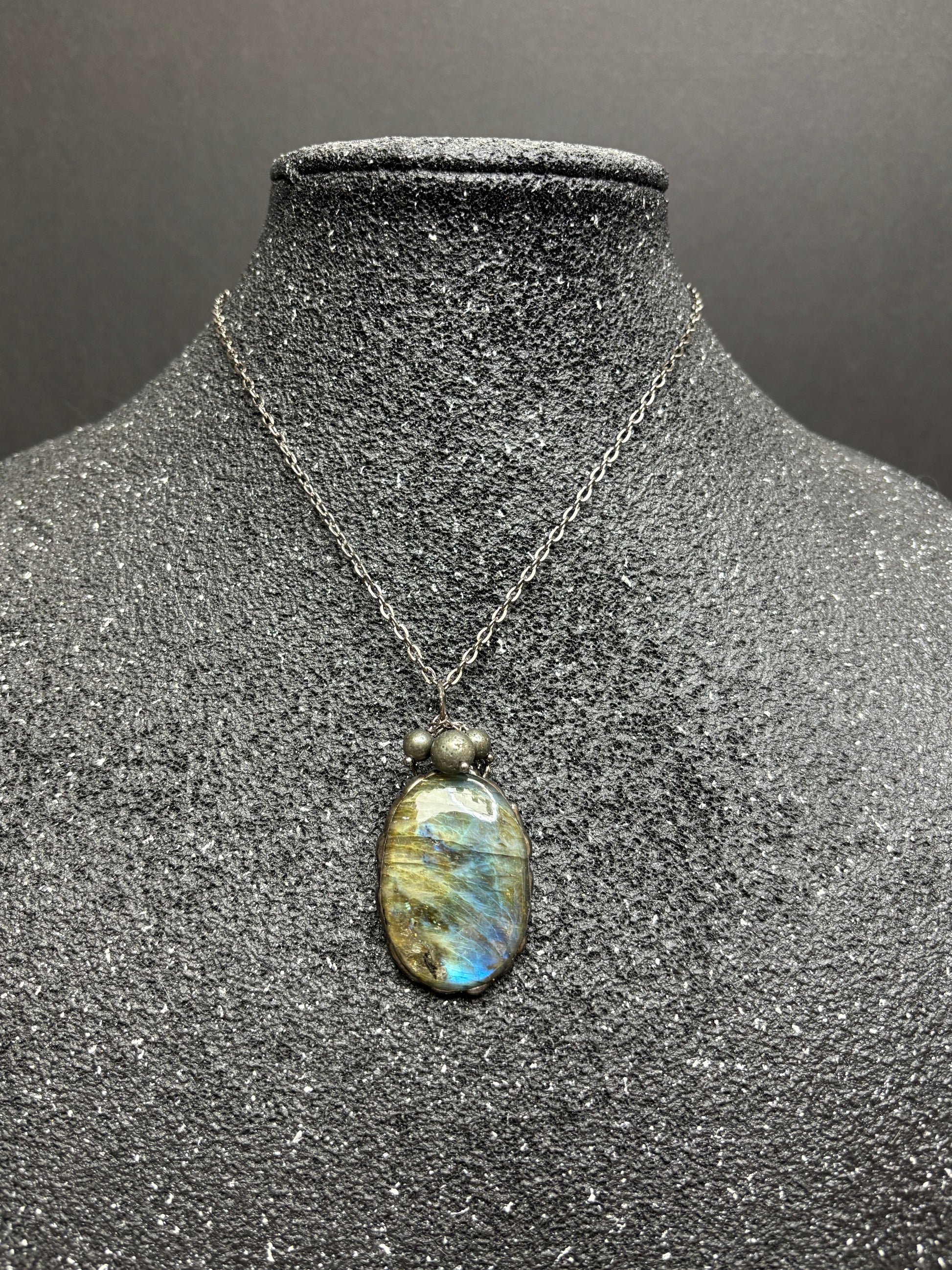 This beautiful oval labradorite pendant features delicate soft solder embellishments and natural pyrite dangles, creating a refined balance of natural beauty and artisanal craftsmanship. Suspended from a 16-inch gunmetal cable chain, it offers a modern yet timeless look. The stainless-steel lobster claw clasp ensures secure and durable wear, making this piece a sophisticated addition to any jewelry collection.
